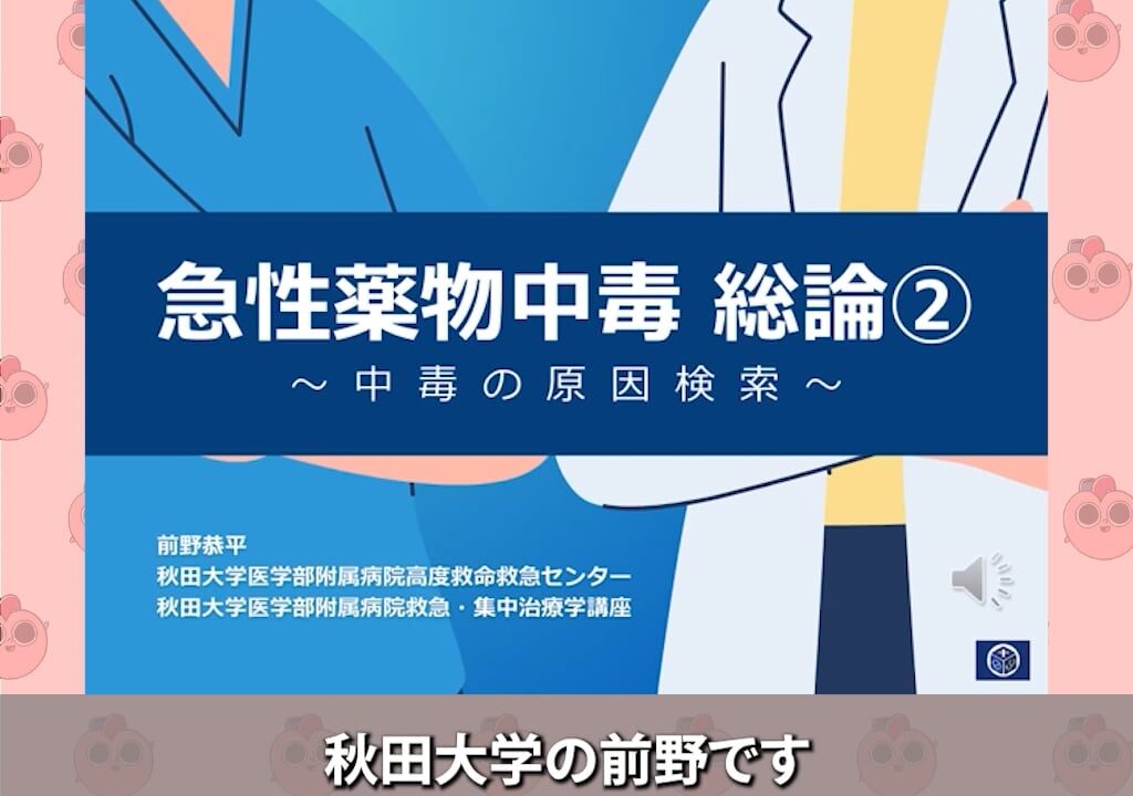 中毒総論の第2回、引き続き秋田大学の前野先生に担当していただきます。前回はABCDEアプローチを使ったプライマリーサーベイを学びました。今回のテーマは「原因物質の推定とその検査」です。
